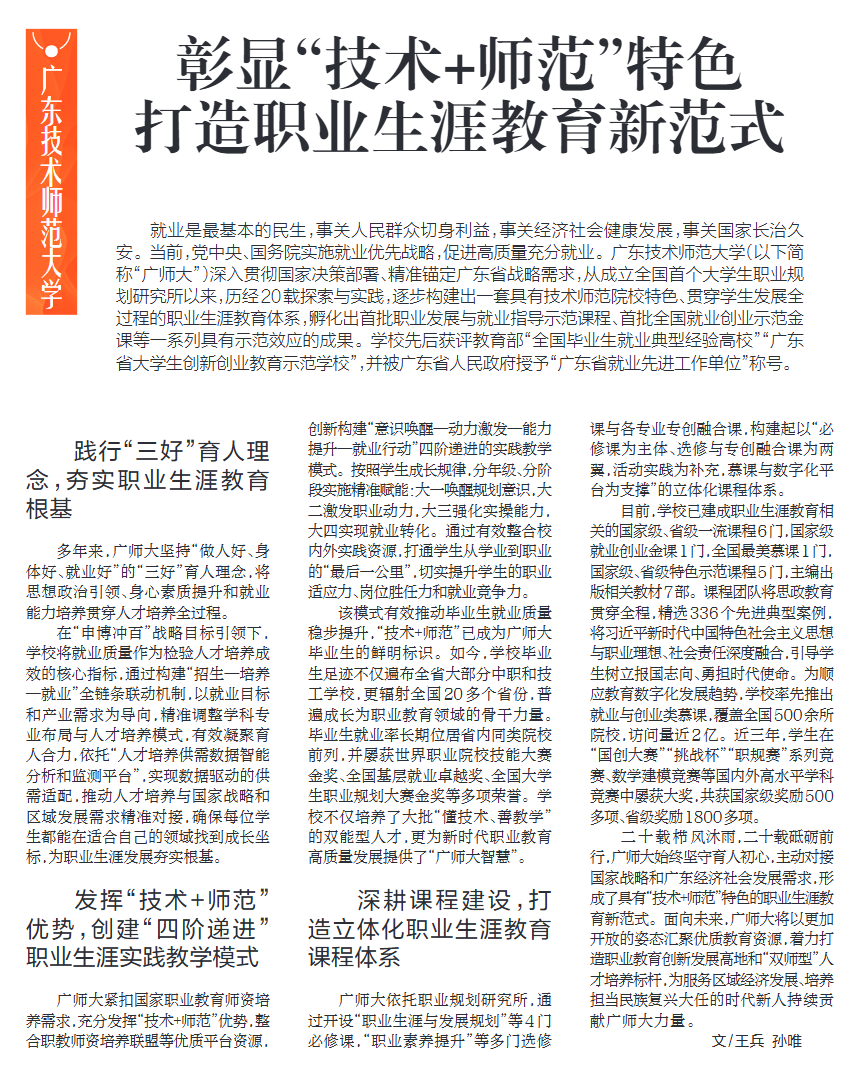 广东技术师范大学(以下简称“广师大”)深入贯彻国家决策部署、精准锚定广东省战略需求,从成立全国首个大学生职业规划研究所以来,历经20载探索与实践,逐步构建出一套具有技术师范院校特色、贯穿学生发展全过程的职业生涯教育体系,孵化出首批职业发展与就业指导示范课程、首批全国就业创业示范金课等一系列具有示范效应的成果。学校先后获评教育部“全国毕业生就业典型经验高校”“广东省大学生创新创业教育示范学校”,并被广东省人民政府授予“广东省就业先进工作单位”称号。