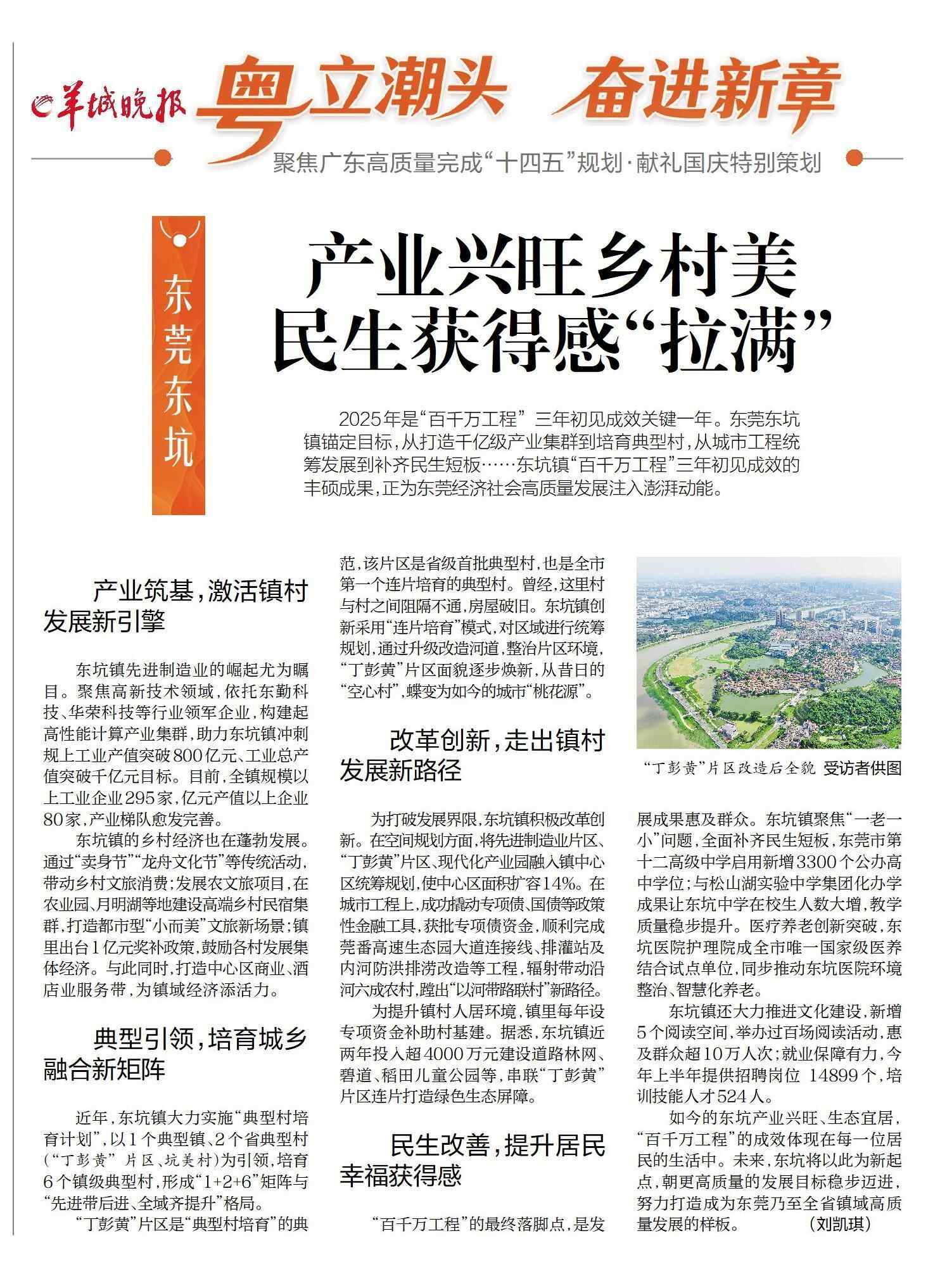 2025年是“百千万工程”三年初见成效关键一年。东莞东坑镇锚定目标,从打造千亿级产业集群到培育典型村,从城市工程统筹发展到补齐民生短板……东坑镇“百千万工程”三年初见成效的丰硕成果,正为东莞经济社会高质量发展注入澎湃动能。