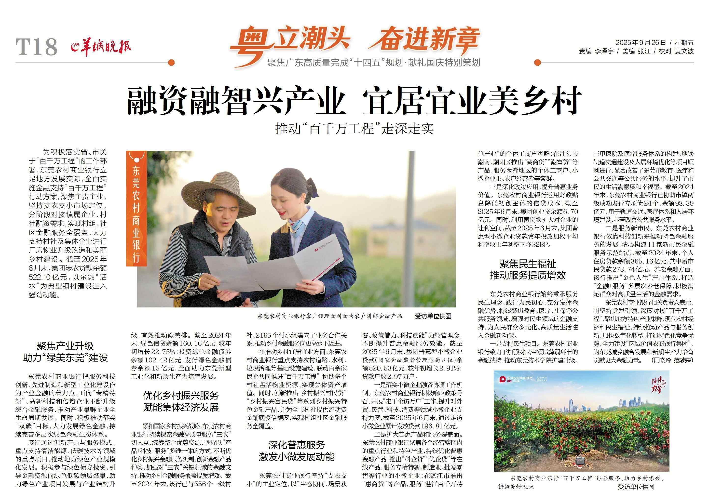东莞农村商业银行相关负责人表示,将坚持党建引领,深度对接“百千万工程”,聚焦地方特色产业集群、现代农村经济和民生福祉,持续推动产品与服务创新,加快数字化转型,打造特色化竞争优势,全力建设“区域价值农商银行集团”,为东莞城乡融合发展和新质生产力培育贡献更大金融力量。
