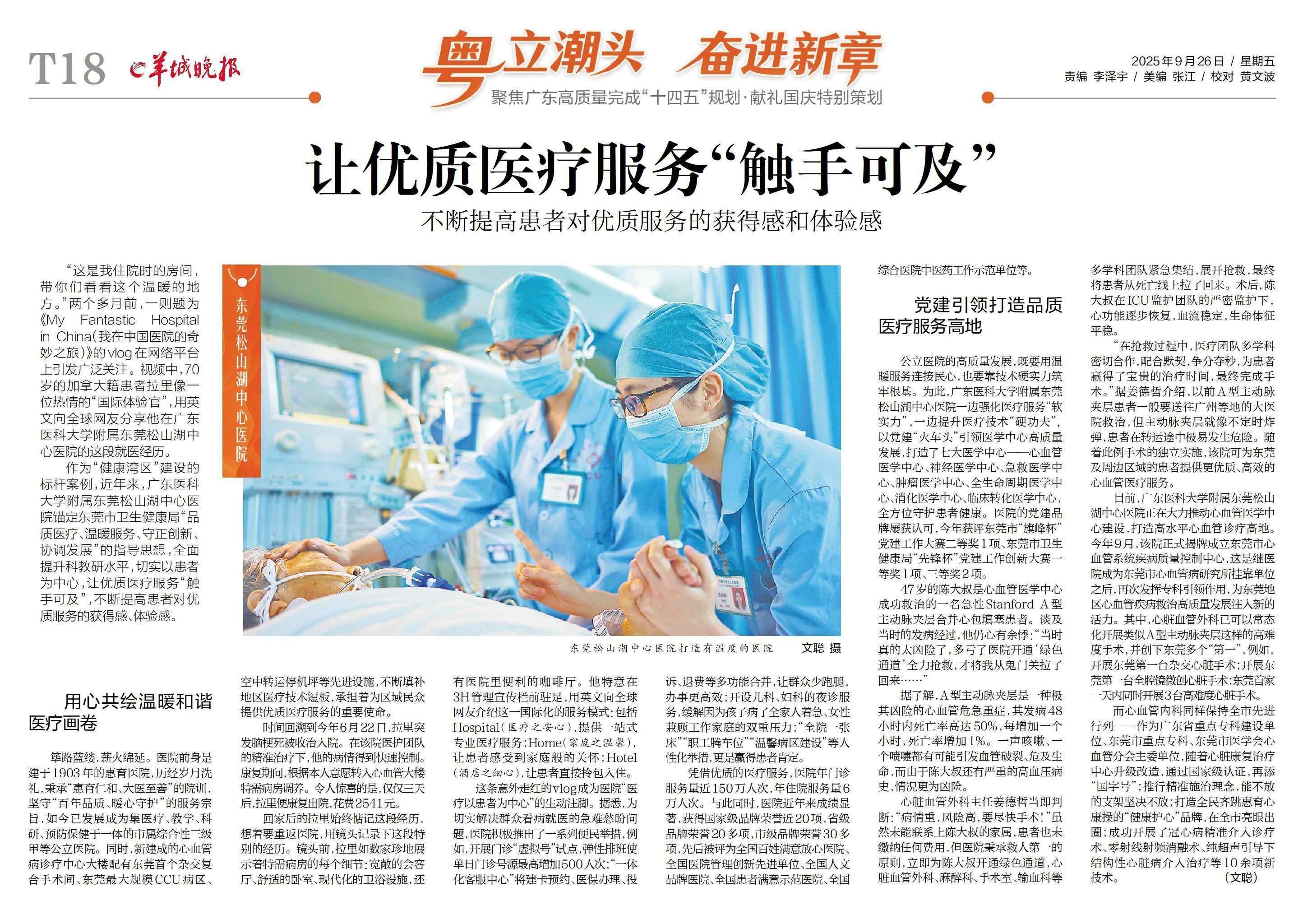 作为“健康湾区”建设的标杆案例,近年来,广东医科大学附属东莞松山湖中心医院锚定东莞市卫生健康局“品质医疗、温暖服务、守正创新、协调发展”的指导思想,全面提升科教研水平,切实以患者为中心,让优质医疗服务“触手可及”,不断提高患者对优质服务的获得感、体验感。