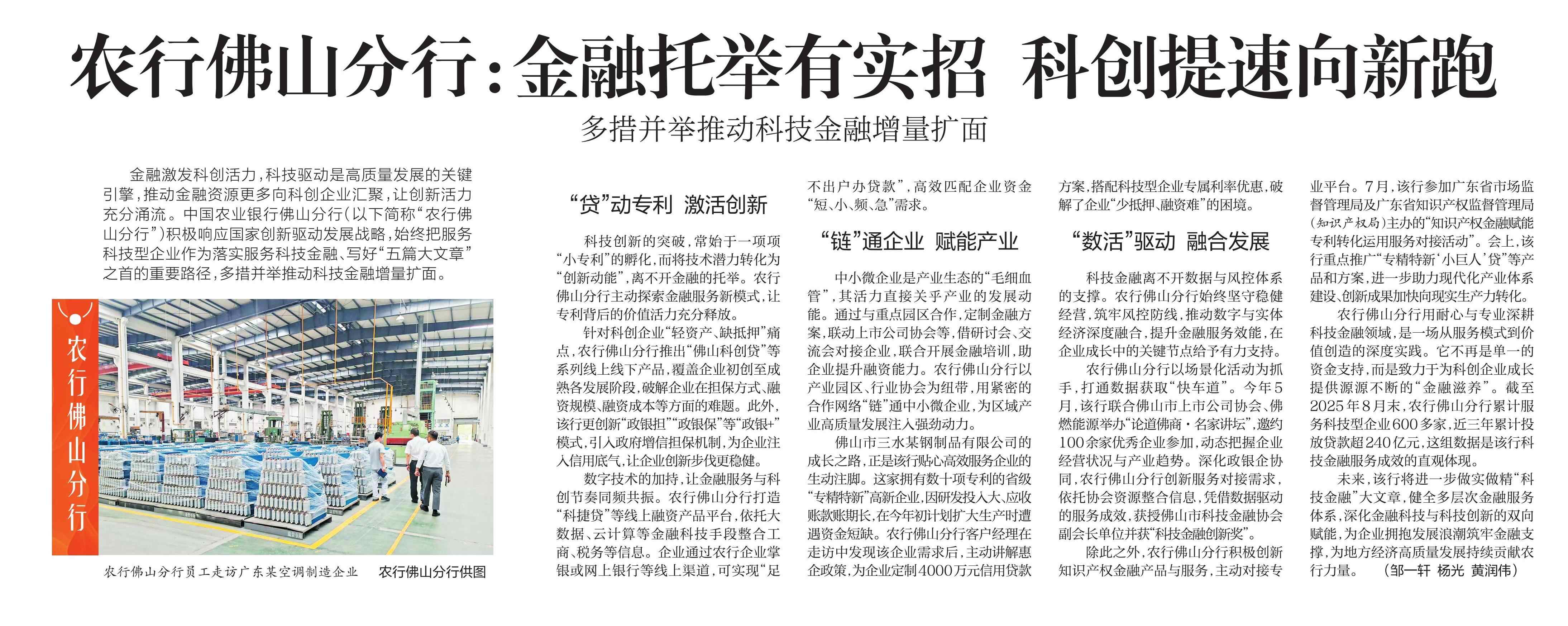 农行佛山分行用耐心与专业深耕科技金融领域,是一场从服务模式到价值创造的深度实践。它不再是单一的资金支持,而是致力于为科创企业成长提供源源不断的“金融滋养”。截至2025年8月末,农行佛山分行累计服务科技型企业600多家,近三年累计投放贷款超240亿元,这组数据是该行科技金融服务成效的直观体现。