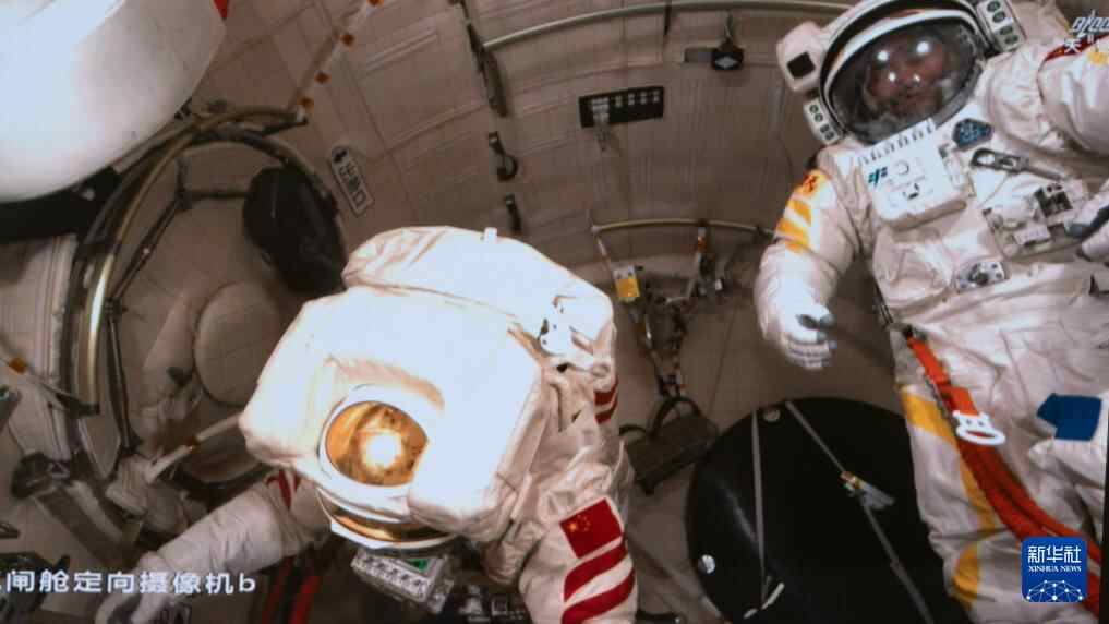 这是9月25日晚在北京航天飞行控制中心屏幕上拍摄的神舟二十号乘组航天员王杰(左)、陈中瑞在舱内工作的画面。