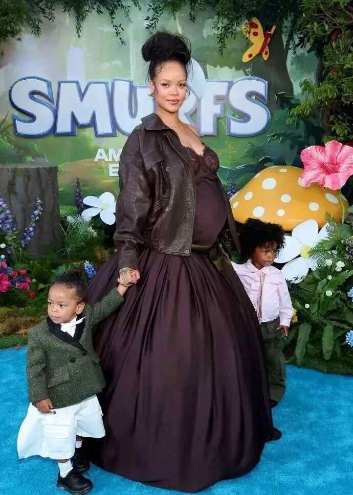 7月13日,Rihanna蕾哈娜带娃亮相《魔法蓝精灵》洛杉矶首映礼,她在片中为“蓝妹妹”配音。蕾哈娜身穿深紫色蕾丝长裙配皮衣,三胎孕肚十分明显,左手一个娃,右手一个娃。当又被问到“新专”催更,蕾哈娜(笑一下算了):“呃呃~《蓝精灵》~”
