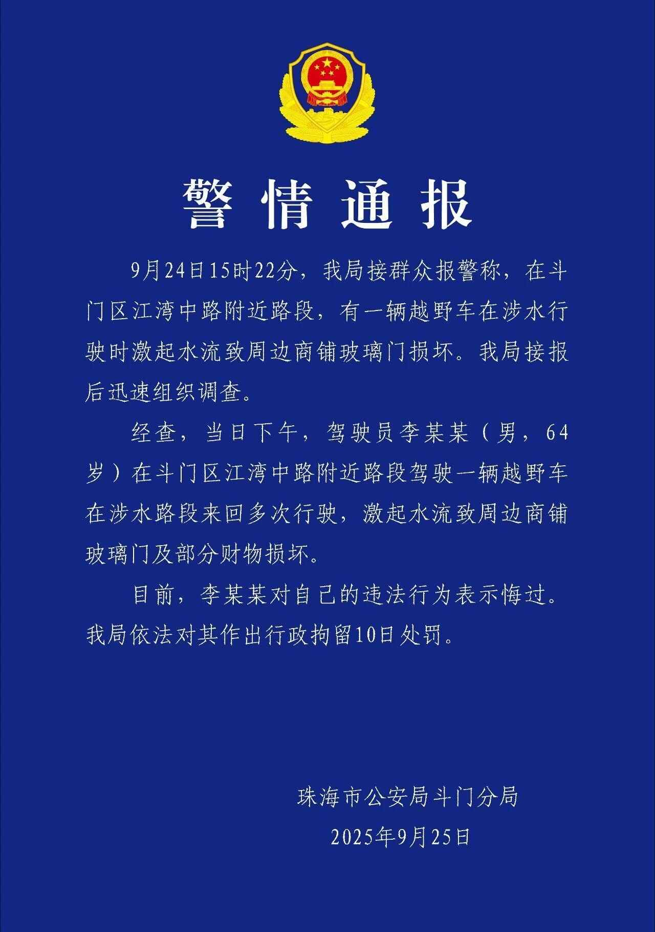 9月24日,64岁的驾驶人李某某,把台风造成积水的路段当成了“游乐场”,竟然开着越野车来回“冲浪”。此举损坏了周边多家商铺的店门及财物,台风本身已造成部分地区内涝,而人为“造浪”进一步加剧了财产损失,人为带来“次生灾害”。此举违反了《中华人民共和国治安管理处罚法》相关规定。警方对其处以行政拘留10日,体现了对台风期间危害公共安全行为的零容忍。