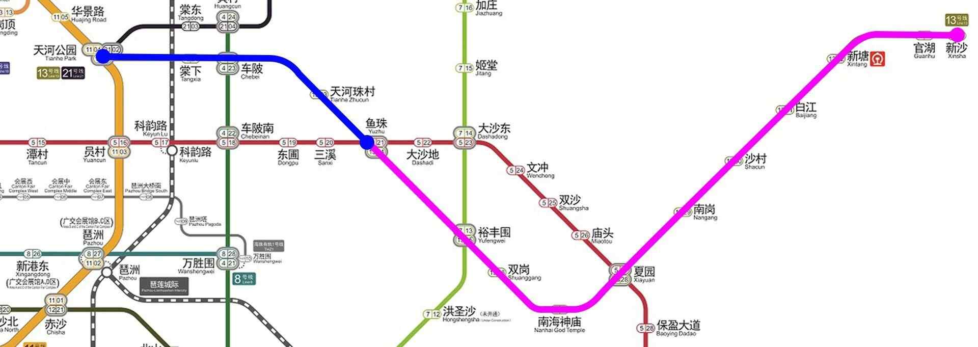 而十三号线一期(鱼珠-新沙),西起黄埔区鱼珠站,东至增城区新沙站,线路全长27.03公里。该线路设鱼珠、裕丰围、双岗、南海神庙、夏园、南岗、沙村、白江、新塘、官湖、新沙等11座车站。