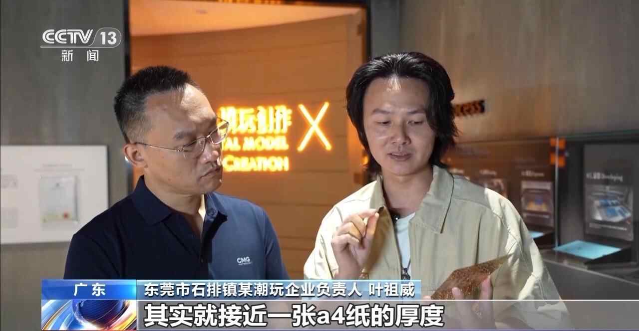 东莞市石排镇某潮玩企业负责人 叶祖威:我的加工的精细度可以达到0.02(毫米),其实就接近一张A4纸的(厚度)。哪怕你要一条头发丝这么宽的一条丝带,它都可以在蚀刻片上面直接给你蚀刻出来。