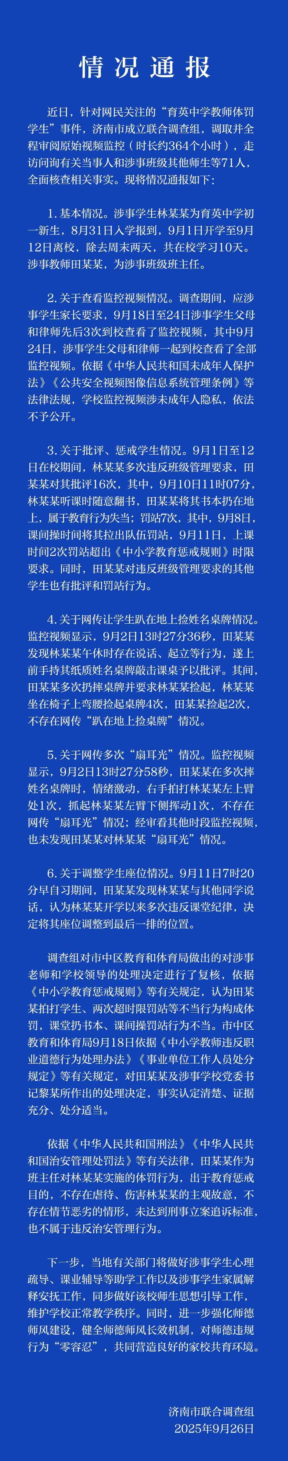 9月26日,济南市联合调查组就“育英中学教师体罚学生”事件发布情况通报: