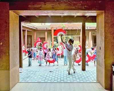 新疆库车市龟兹小巷的非遗工坊里,暑期支教大学生正在教孩子们跳中国舞。本报记者 孙金行摄