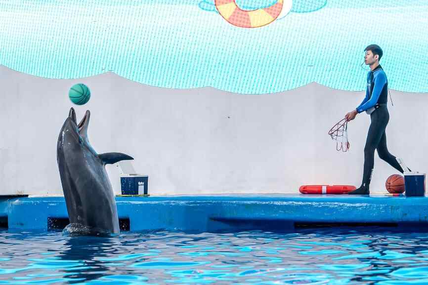 《海豚·精灵之跃》展示中,聪明的海豚将展示水中转呼啦圈、投球等高难度动作,跃出水面划出优美弧线,尽显海洋精灵的运动天赋。