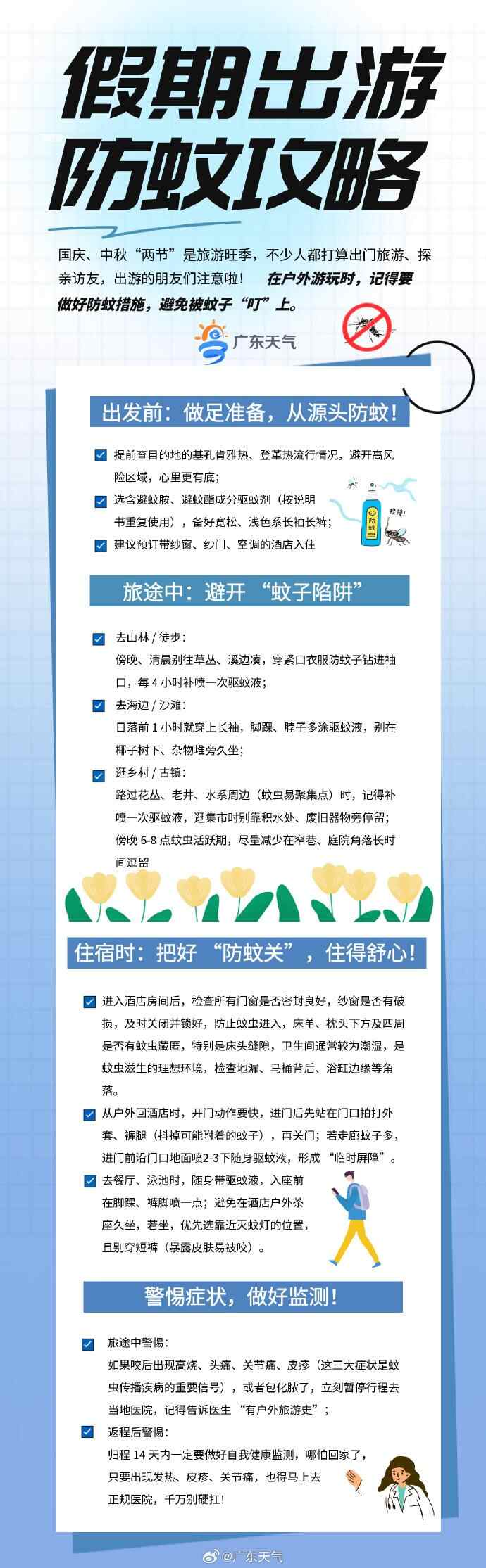 近期基孔肯雅热、登革热多发,请公众要积极行动起来,及时清理家中及周边积水,安装纱门纱窗或使用蚊帐。气温变化影响蚊子活跃度,尤其在早上7时至9时和17时至19时为伊蚊活动高峰,请做好防护措施,谨防蚊虫侵扰。