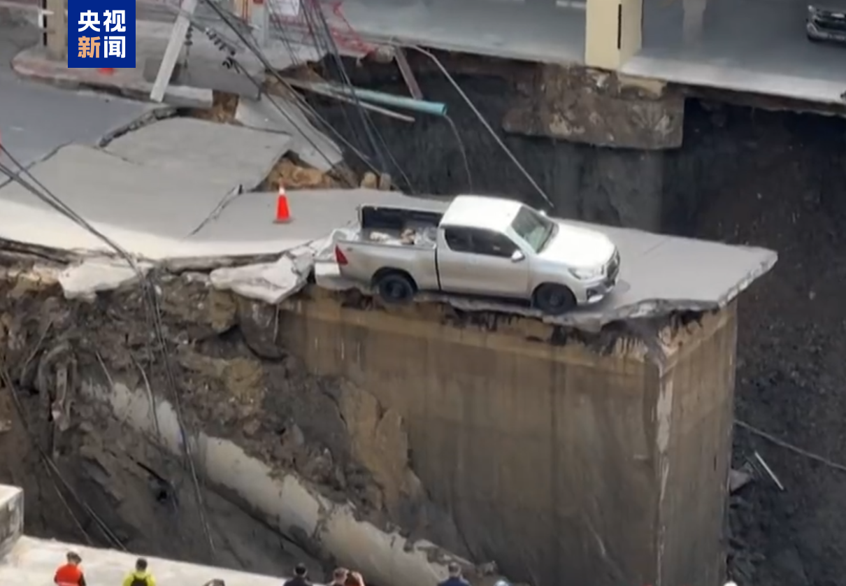 9月24日,泰国曼谷一道路发生大面积塌陷,形成“巨型深坑”。现场画面显示,多辆汽车悬于坑洞边缘,地下水管爆裂导致水流喷涌。