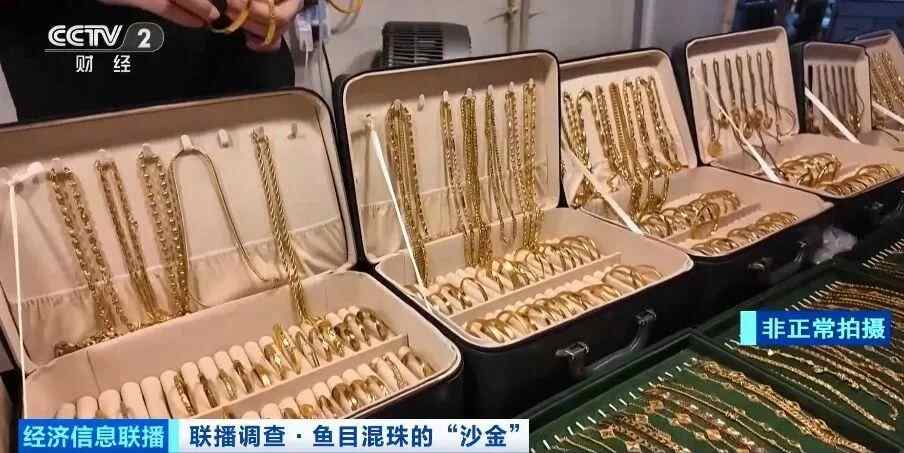 出厂价10元左右的黄铜镀金首饰,到了街头夜市上,就摇身一变成了40元左右的“沙金”首饰。而在网上的直播间里,更是被主播包装成所谓越南提纯“沙金”,一件首饰卖到上百元。也就是说,虽然“沙金”的名称,给人一种天然黄金副产品的印象,但实际上,当前市面上销售的绝大多数所谓“沙金”饰品,与黄金并无关系。浙江义乌的商户还告诉记者,虽然网上大肆宣传所谓的“沙金”饰品内外一色、火烧后仍然是金色,事实并非如此。