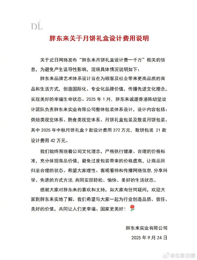9月24日晚,胖东来实业有限公司发布声明,关于近日网络发布“胖东来月饼礼盒设计费一千万”相关的信息,为避免产生误导性影响,现将具体情况说明如下: