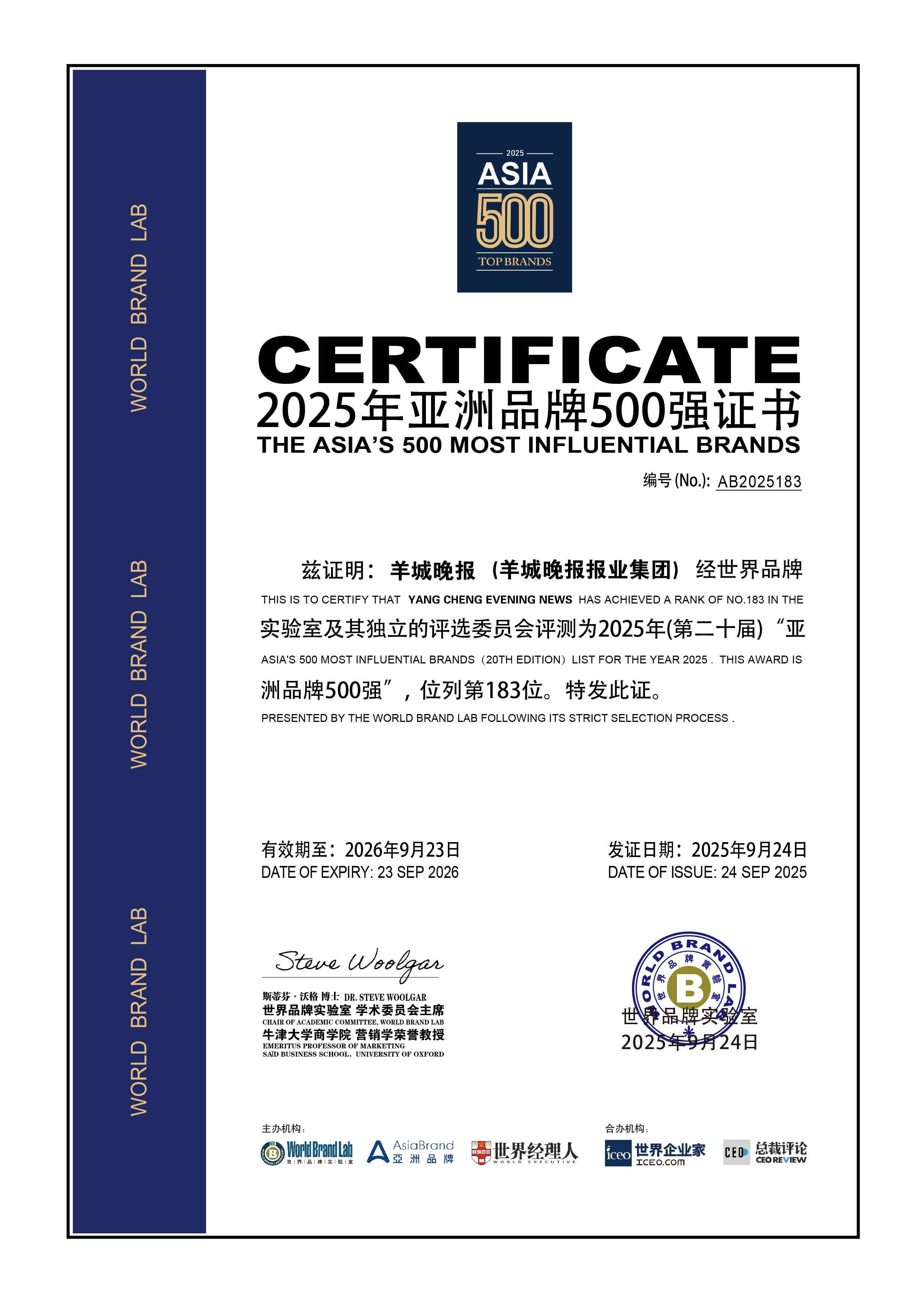 《亚洲品牌500强》从2006年起每年发布一次,评判标准是品牌的亚洲影响力。世界品牌实验室学术委员会主席、牛津大学教授斯蒂芬•沃格分析,评价亚洲品牌影响力( Asian Brand Influence)的基本指标包括市场占有率、品牌忠诚度和亚洲领导力。其中,衡量品牌忠诚度以我信品牌的评级数据为参考,衡量亚洲领导力特别是ESG评分时,以超级财经(Super Finance)的ESG数据库为参考。