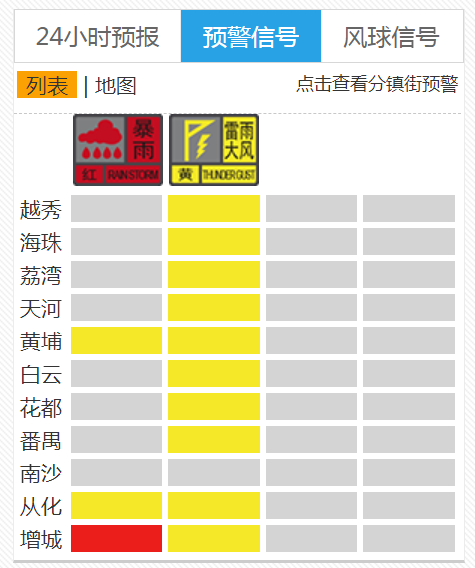 截至9月25日12时42分,增城发布分镇街暴雨红色预警信号,黄埔、从化发布暴雨黄色预警信号,广州全市除南沙区外均已发布雷雨大风黄色预警信号,请市民注意防御。