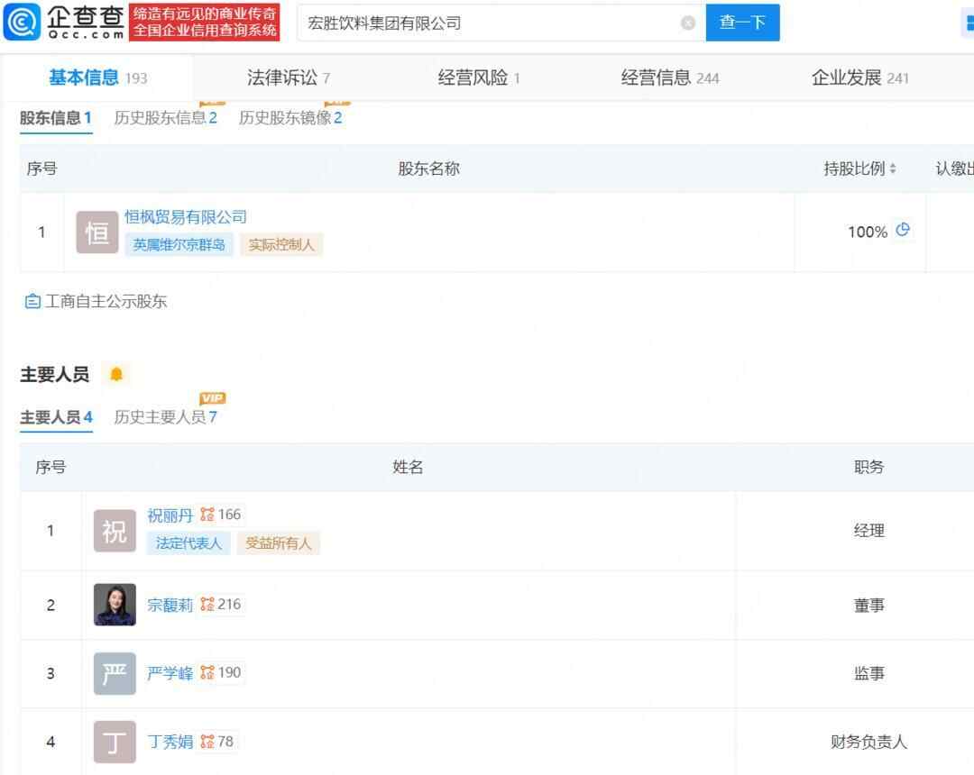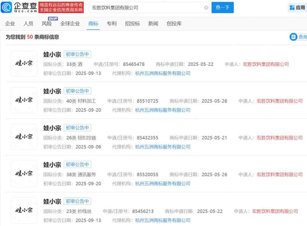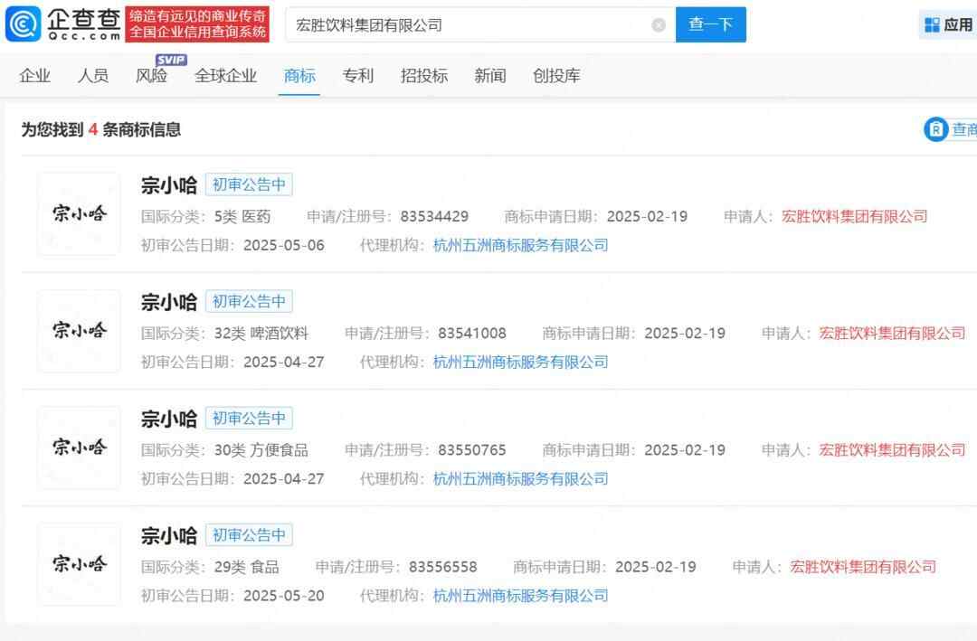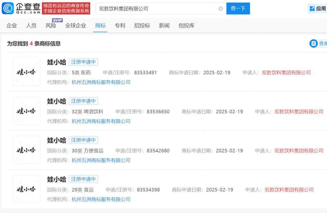 企查查APP显示,今年2月以来,宗馥莉任董事的宏胜饮料集团有限公司申请注册多枚“娃小宗”、“娃小哈”、“宗小哈”商标,国际分类涉及啤酒饮料、方便食品、材料加工等。目前“娃小哈”商标状态在注册申请中,“娃小宗”、“宗小哈”商标处于初审公告状态。