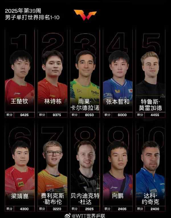 据@WTT世界乒联,国际乒联2025年第39周世界排名,梁靖崑位列第六。