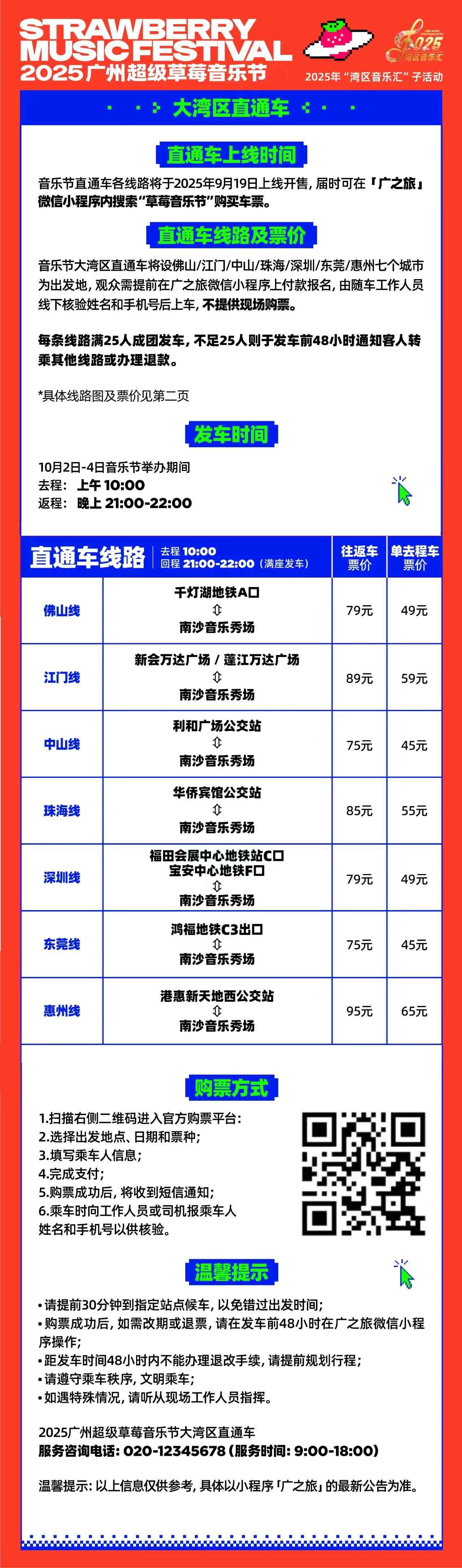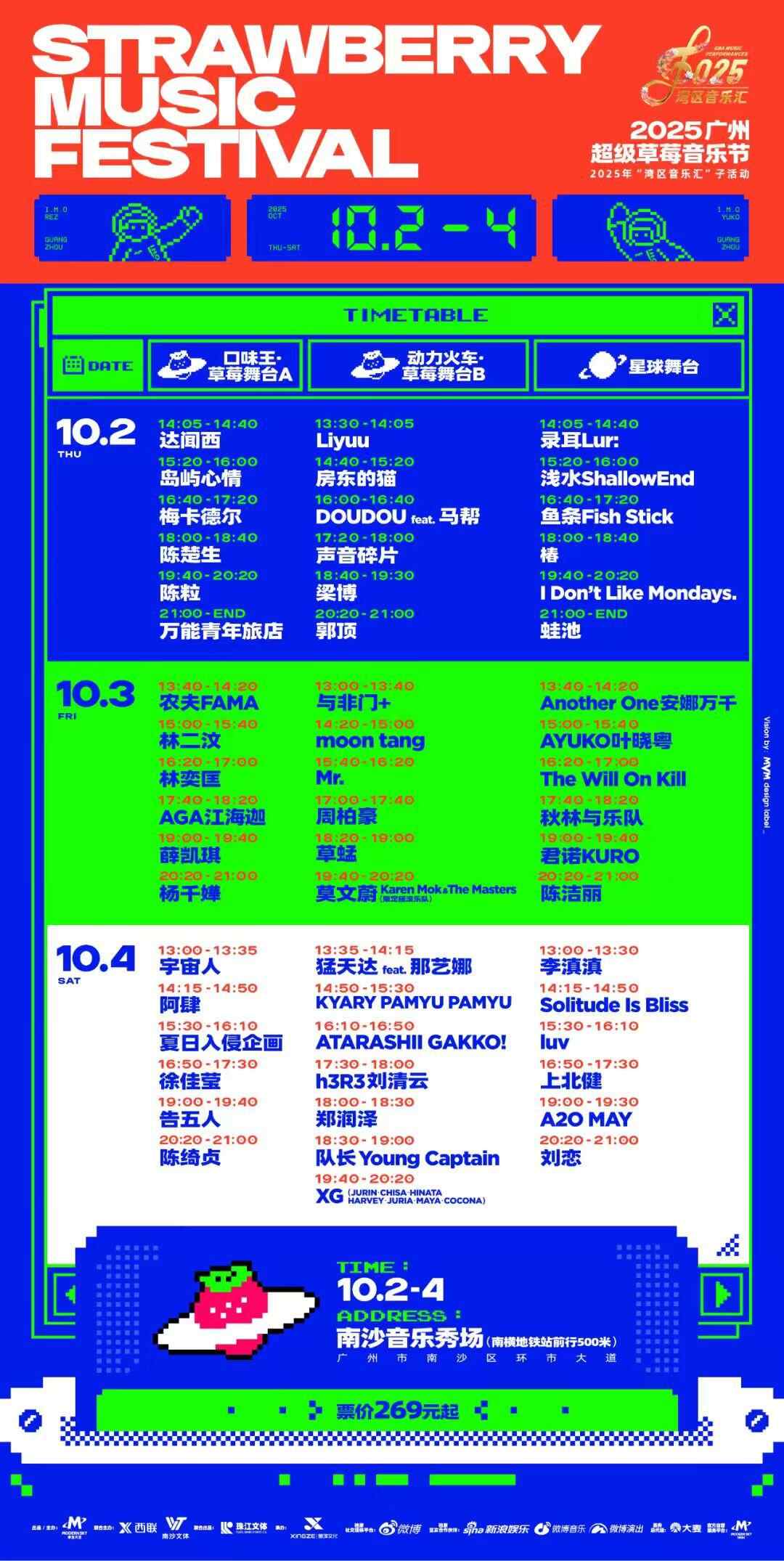 除音乐演出外,音乐节现场将设置GAME HOUSE游戏体验区,提供十款游戏及集章任务,参与者有机会获得广州限定礼品。草莓SPACE区域继续设立“悄悄话与占卜屋”,观众可通过社交互动获取幸运签与明信片祝福。