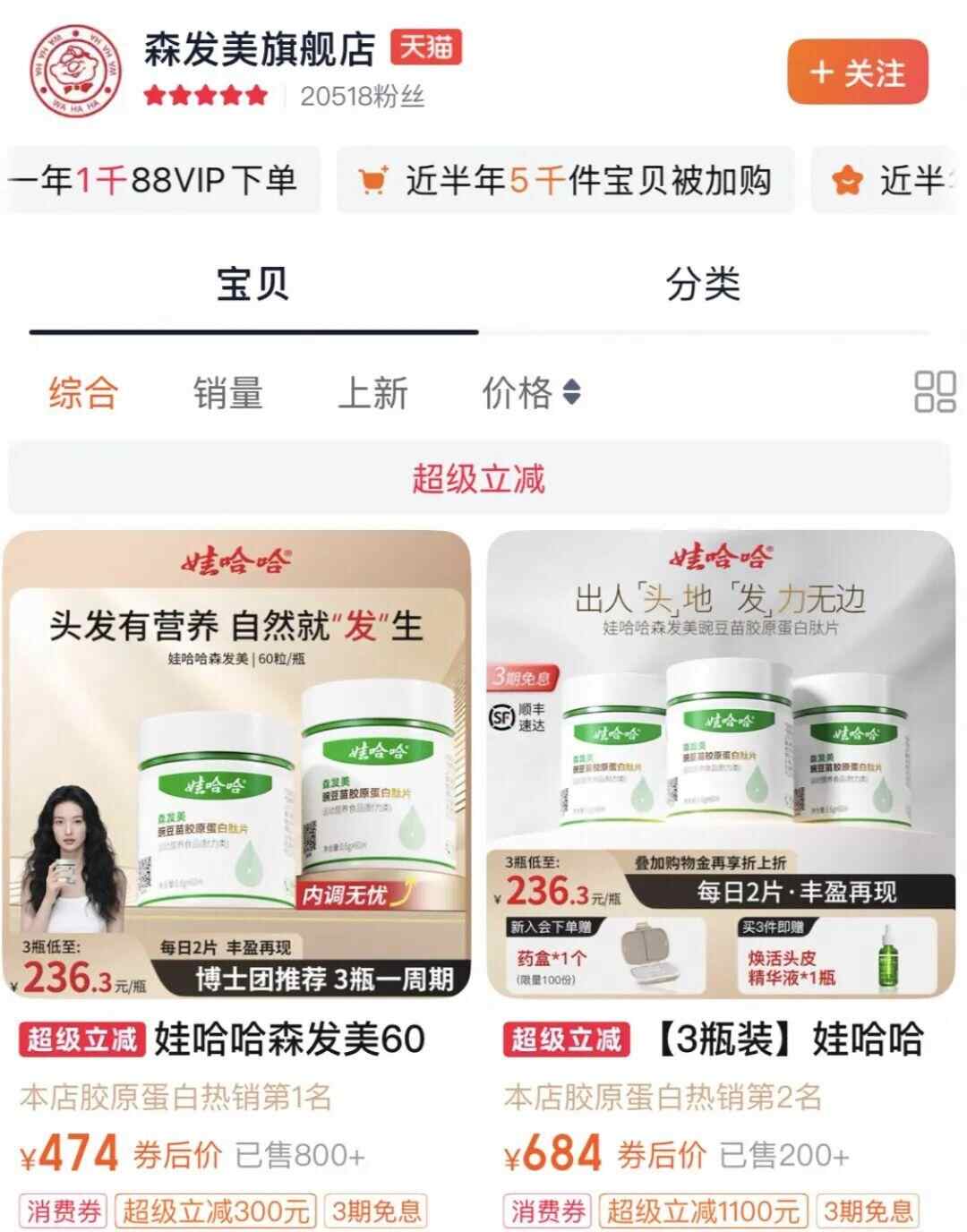 娃哈哈品牌授权还涉及到功能食品类的产品,记者在一家名为“森发美”的天猫店看到,包括娃哈哈品牌的豌豆苗胶原蛋白肽片、娃哈哈PQQ(泡腾片)、益生菌以及褪黑素等具有保健功能的产品,销量最高的产品超过1000单。该淘宝店铺的资质显示的是“杭州哈哈优品科技有限公司”,与娃哈哈相关公司并无关联。