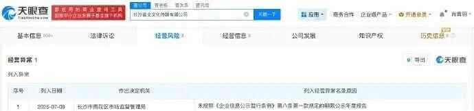 经营风险信息显示,今年7月,长沙蓝北文化传媒有限公司因未依照规定的期限公示年度报告,被长沙市雨花区市场监督管理局列入经营异常名录。