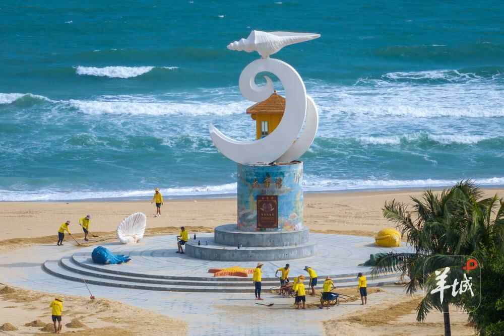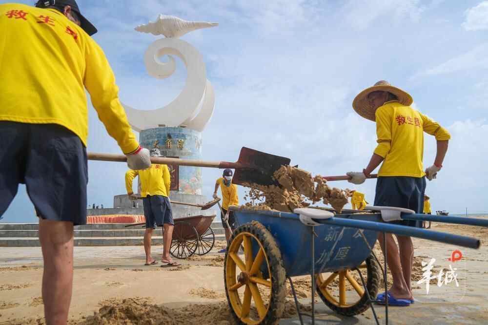海陵岛大角湾景区是当地颇受游客青睐的景点。9月25日下午,景区里响着铁锹铲沙的“哗啦”声、桌椅搬运的“吱呀”声——400余名员工身着统一工作服,全员出动投入清理工作。