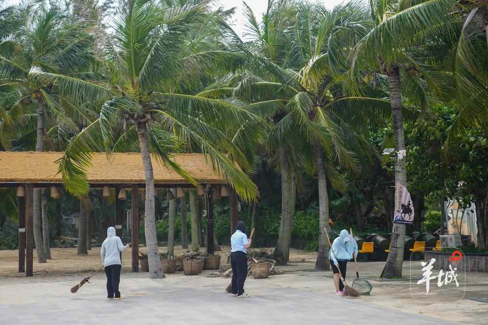 景区总经理王凤宝在现场巡查,他指着不远处被吹断的树枝告诉记者:“这次台风把几棵30年的椰树都吹倒了,部分房屋轻微受损。不过我们早分好了工,每个班组负责一块:有的砍断树枝运走,有的去采购物资,争取27号能恢复营业。”