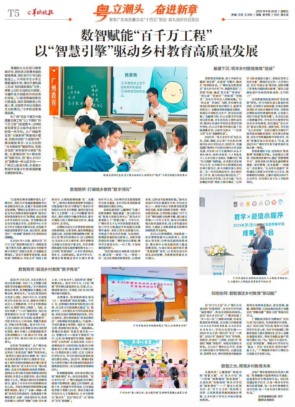 从越秀的“云端教研”到海珠的“智慧大脑”,从“星火计划”的“六供给”到黄埔的“精准教研”,从高校的“校地协同”到乡村学校的“辐射帮扶”……广州正以数智为犁,在“百千万工程”的田野上深耕,让优质教育资源跨越城乡界限,让乡村孩子享有公平而有质量的教育。
