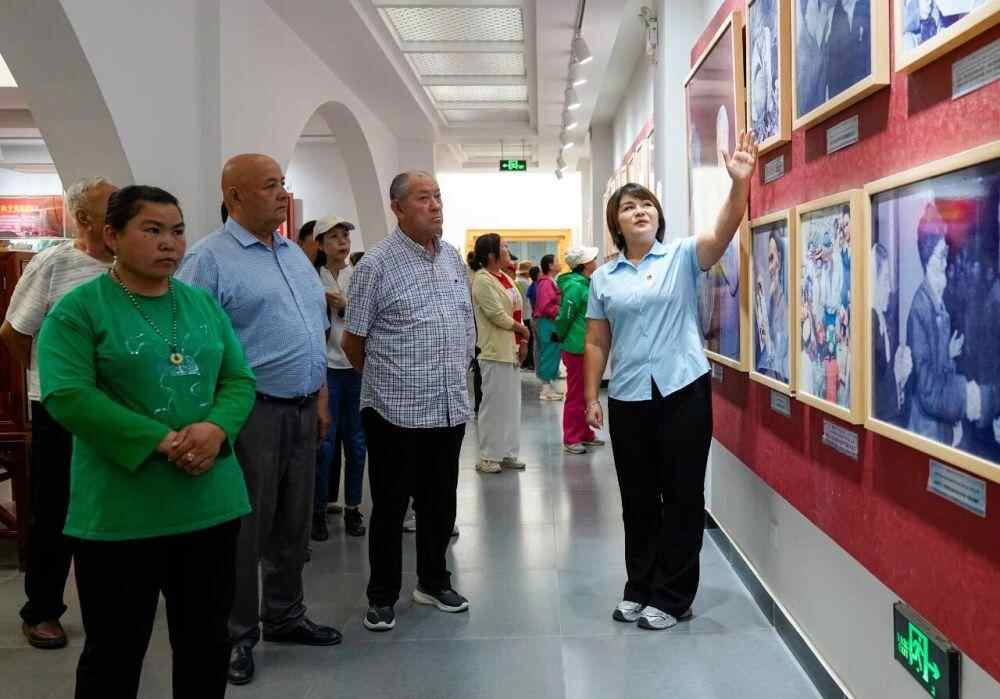 在新疆和田地区于田县库尔班·吐鲁木纪念馆,如克亚木(右一)向参观者介绍展出的照片(2025年9月14日摄)。新华社记者丁磊摄