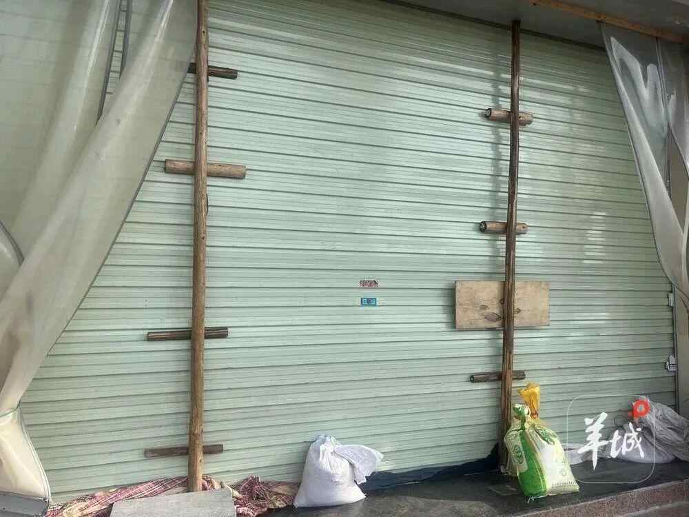 台风来临前,海陵岛商铺工作人员用几根粗木棍十字交叉,牢牢抵住卷闸门。