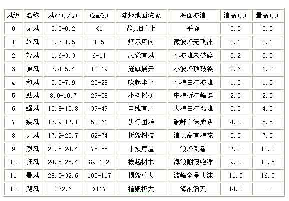 风力是指风吹到物体上所表现出的力量的大小。一般根据风吹到地面或水面的物体上所产生的各种现象,把风力的大小分为13个等级,最小是0级,最大为12级。