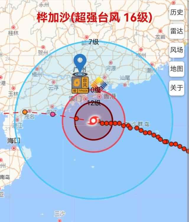 截至9月24日7时,今年第18号台风“桦加沙”(超强台风级)位于阳江市东偏南方向约210公里的南海北部海面上,最大风力16级(55米/秒),八级大风范围半径约350公里,十级大风范围半径约160公里。