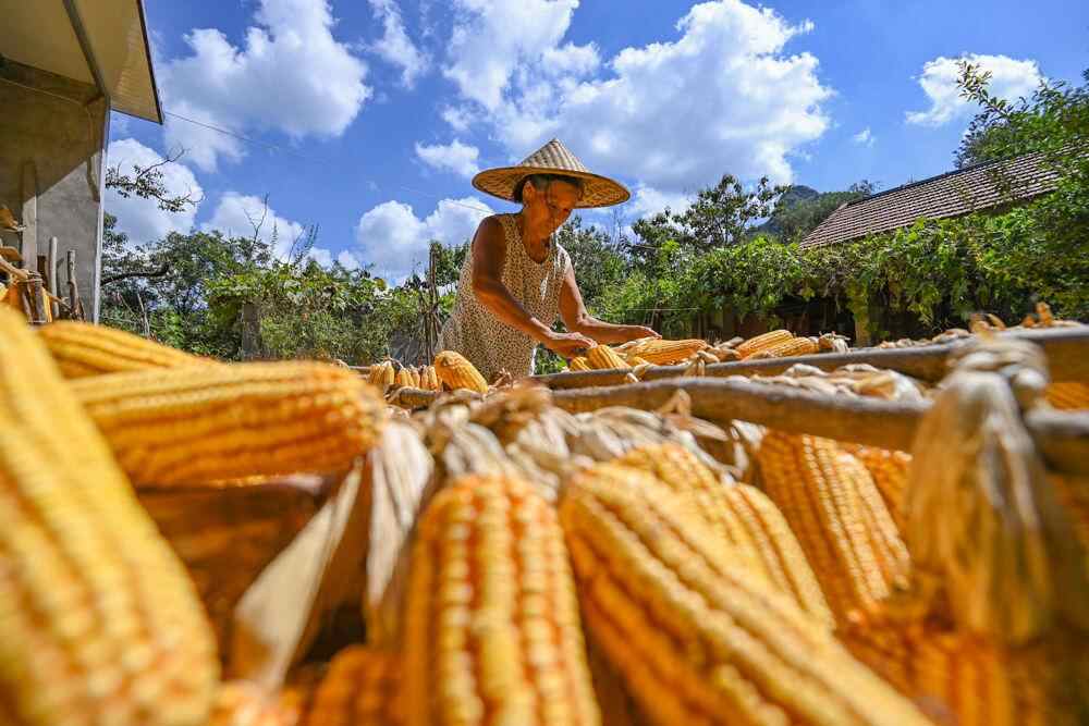 ↑2025年9月13日,农民在山东省青州市庙子镇局子峪村晾晒玉米。CICPHOTO/王继林 摄