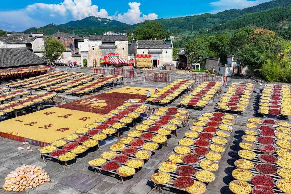 ↑2025年9月15日,农民在安徽省黄山市徽州区呈坎村晾晒稻谷、玉米、南瓜、红辣椒、笋干等农作物。(无人机照片)CICPHOTO/潘祯祥 摄