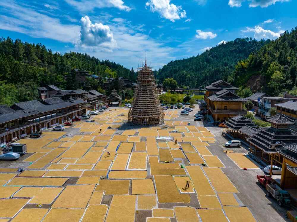 ↑2025年9月15日,农民在贵州省从江县高增乡小黄侗寨晾晒稻谷。(无人机照片)CICPHOTO/吴德军 摄