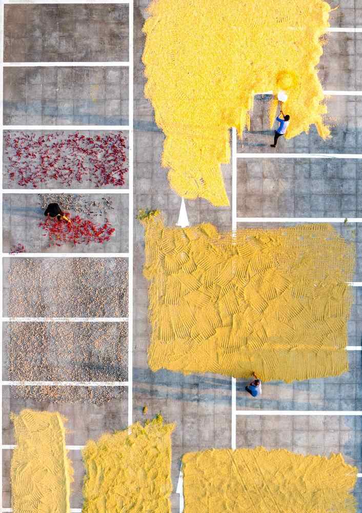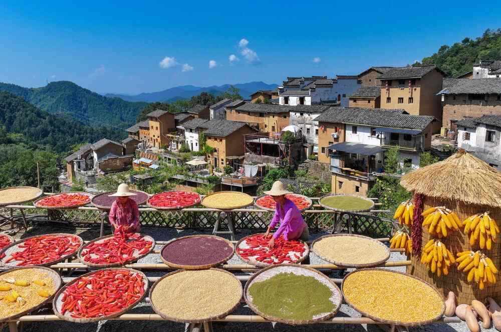 金秋时节,多地农民趁着晴好天气,将收获的农作物在房前屋后晾晒,五彩缤纷的农作物与乡村景致交相辉映,勾勒出一幅幅美丽的丰收画卷。