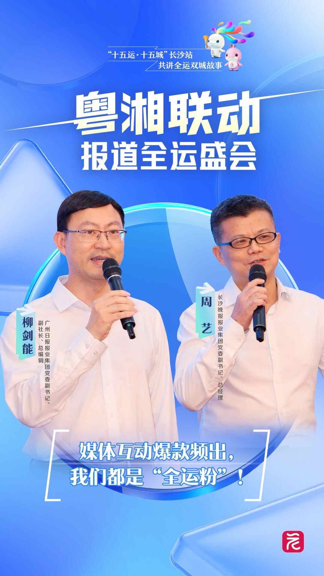 “长沙米粉和广州肠粉见面了,我们都是全运粉!”长沙晚报报业集团党委副书记、总经理周艺笑言,这条稿件就是由广州日报微博发布,再由长沙晚报转发,在社交媒体刷屏,可见长沙与广州媒体开展的创意互动,已经开始携手打造爆款了:“这也意味着十五运和十六运已经紧密相连。”他表示,为全心全力做好十五运报道,长沙晚报将推出“湘约大湾区、筑梦全运会”的相关策划,不仅展现体育湘军、奥运湘军的力量,还将积极开展一系列宣传:“广州、长沙都是美景、美食众多的城市,未来将通过打造‘文旅双城记’‘美食双城记’令两城接力全运,让全运会的情感和话题无缝衔接。”