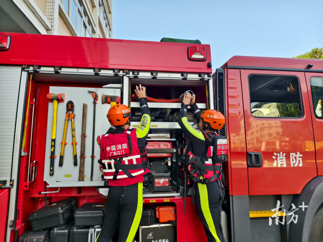 消防救援人员正在对装备进行清点维护。供图:粤消宣
