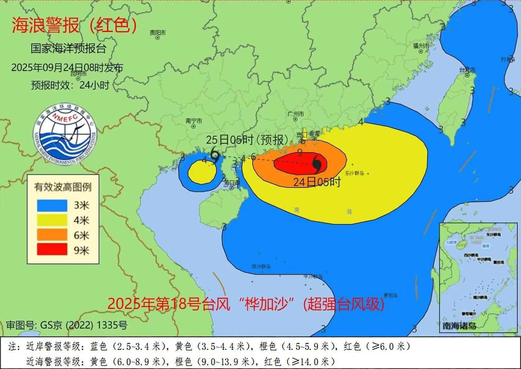 预计9月24日上午到25日上午,南海西北部将出现7到12米的狂浪到狂涛区,南海东北部将出现4到6米的巨浪到狂浪区,北部湾将出现3到4.5米的大浪到巨浪区,近海海域海浪预警级别为橙色;