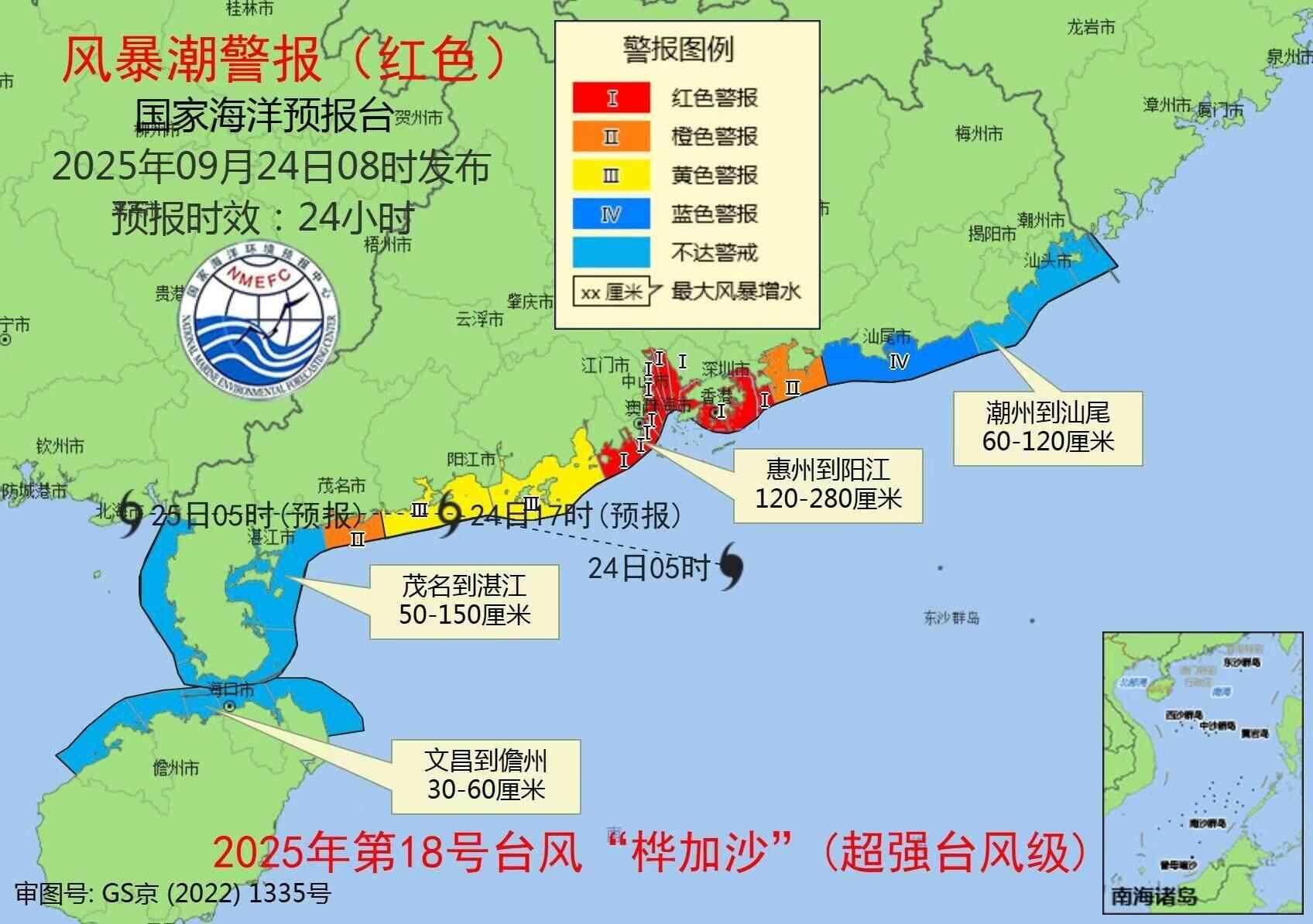 预计9月24日上午至25日上午,广东潮州到汕尾沿海将出现60到120厘米的风暴增水,广东惠州到阳江沿海将出现120到280厘米的风暴增水,广东茂名到湛江沿海将出现50到150厘米的风暴增水,海南儋州到文昌北部沿海将出现30到60厘米的风暴增水。
