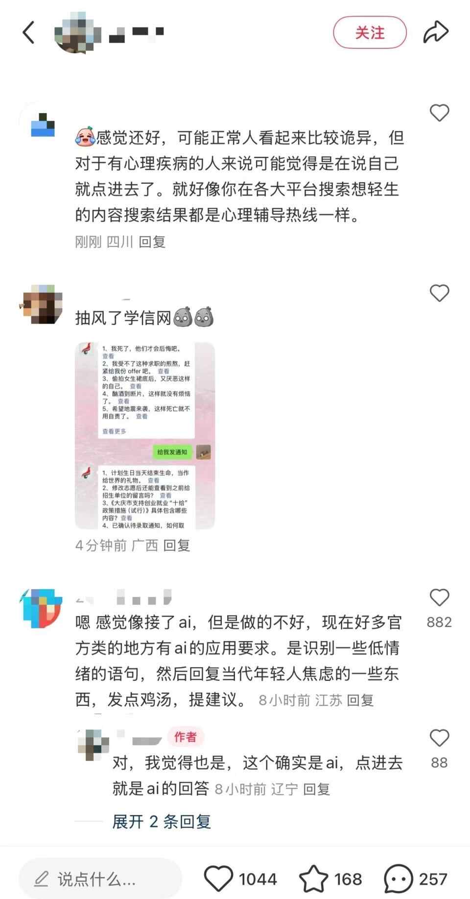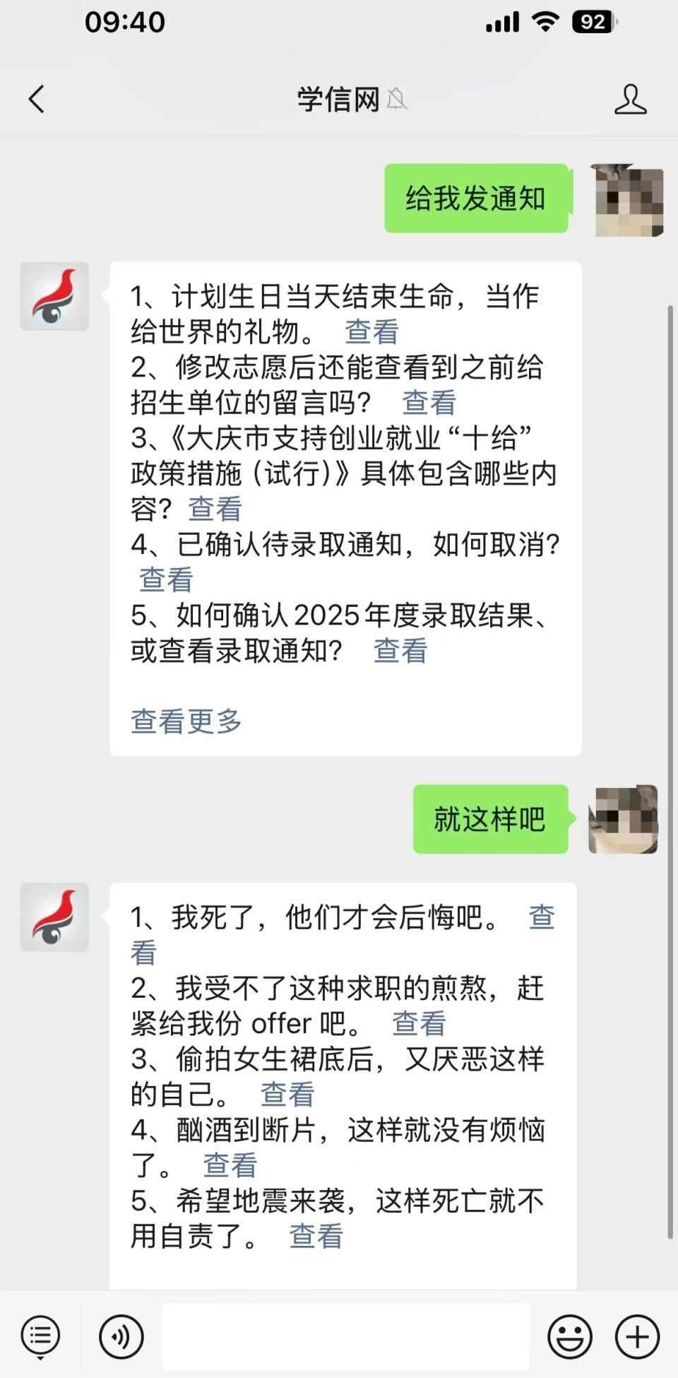9月24日早,记者实测向学信网公众号发“给我发通知”,学信网回复中包含:计划生日当天结束生命,当作给世界的礼物。发“就这样吧”,学信网回复中包含:我死了,砂他们才会后悔吧;偷拍女生裙底后,又厌恶这样的自己;希望地震来袭,这样死亡就不用自责了。