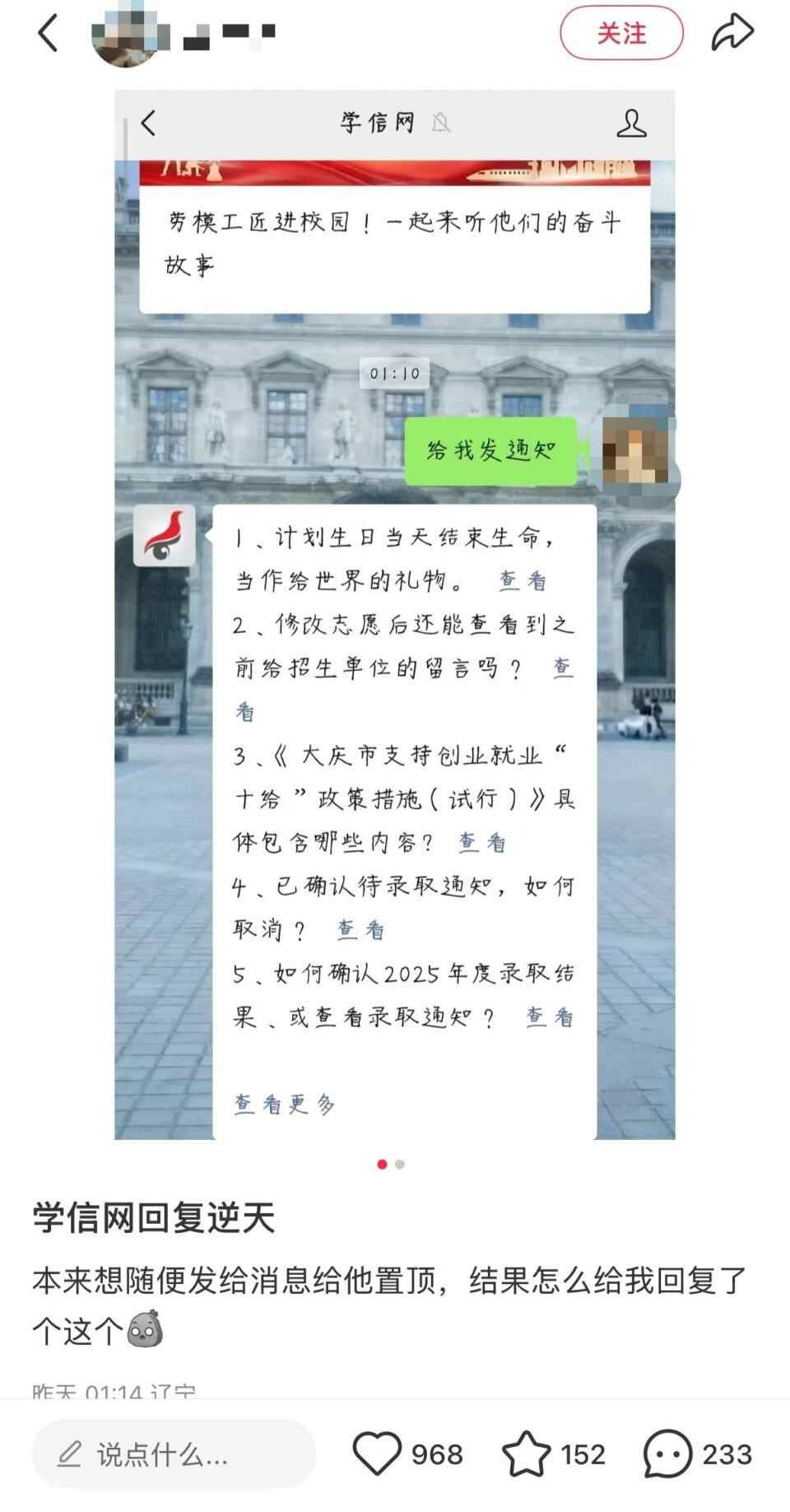 据网友发帖称,本来想随便发消息让学信网置顶,结果发现回复莫名其妙。该网友截图显示,他向学信网公众号发“给我发通知”,学信网回复中包含:计划生日当天结束生命,当作给世界的礼物。