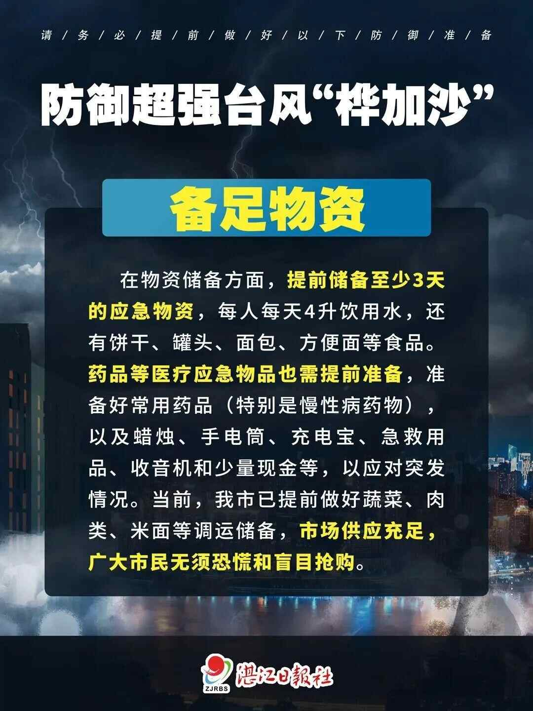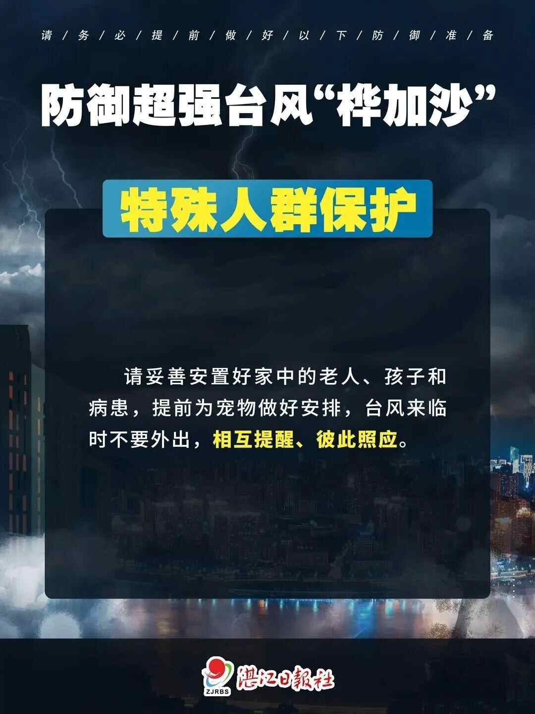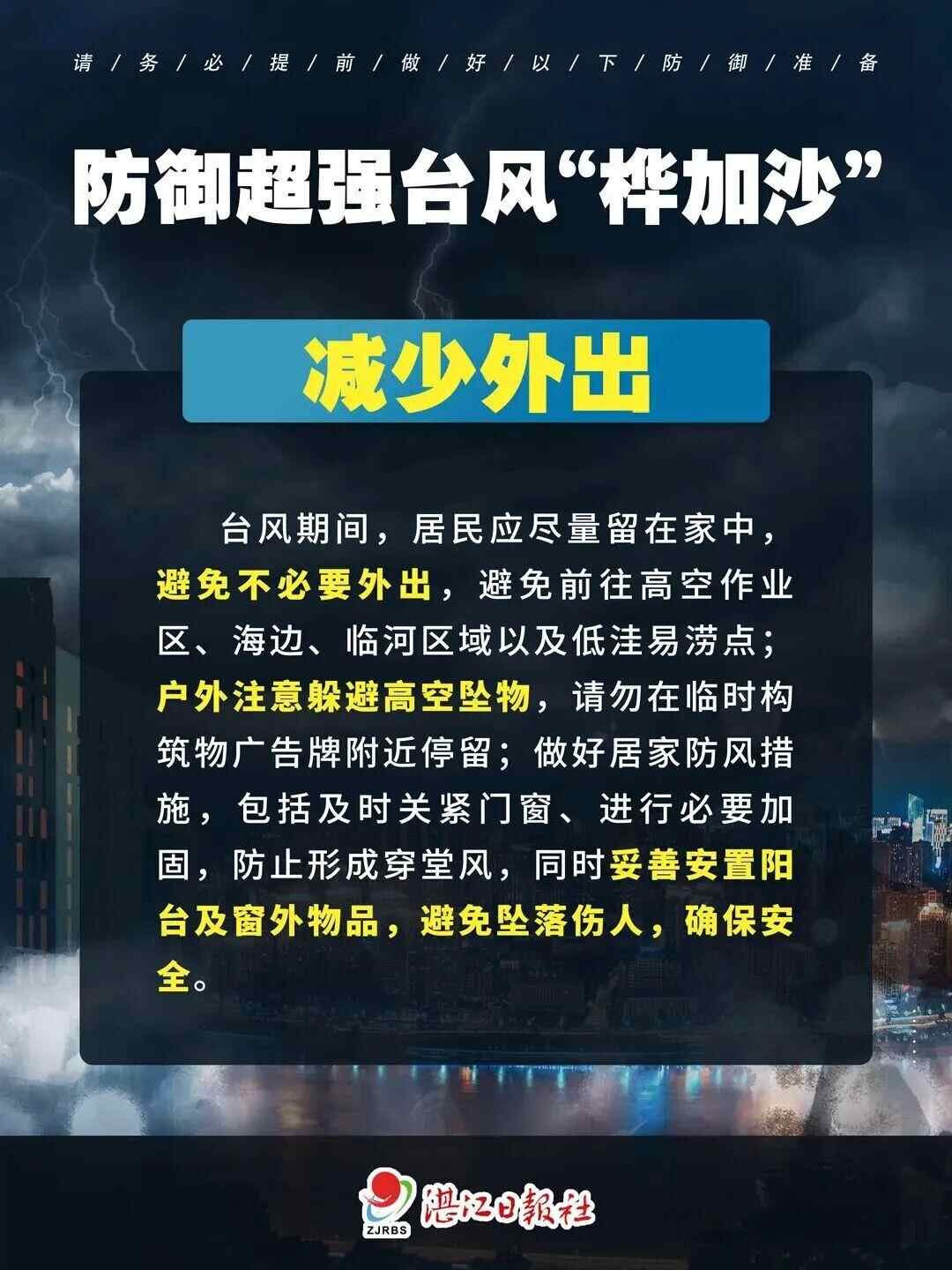 预计,台风“桦加沙”于9月24日下午到夜间以强台风级或超强台风级(14~16级)在台山到徐闻沿海地区登陆,给湛江带来严重风雨影响。依照《湛江市防汛防旱防风防冻应急预案》有关规定和相关单位会商结果,市三防指挥部决定于9月24日9时30分将防风Ⅱ级应急响应调整为防风Ⅰ级应急响应。
