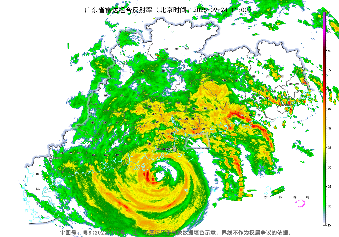 24日余下时间,粤西、珠三角中南部、粤东沿海市县有暴雨到大暴雨局部特大暴雨(雨量70~150毫米,局地最大300毫米左右),其余市县有中到大雨局部暴雨。