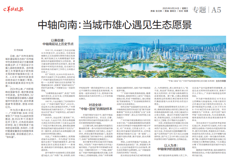 “广州新中轴纵贯海珠湿地,随着中轴南延,湿地将事实上成为广州城央湿地公园,形成‘中轴即绿心,绿心即湿地’的崭新格局。”广东省体制改革研究会执行会长彭澎表示。