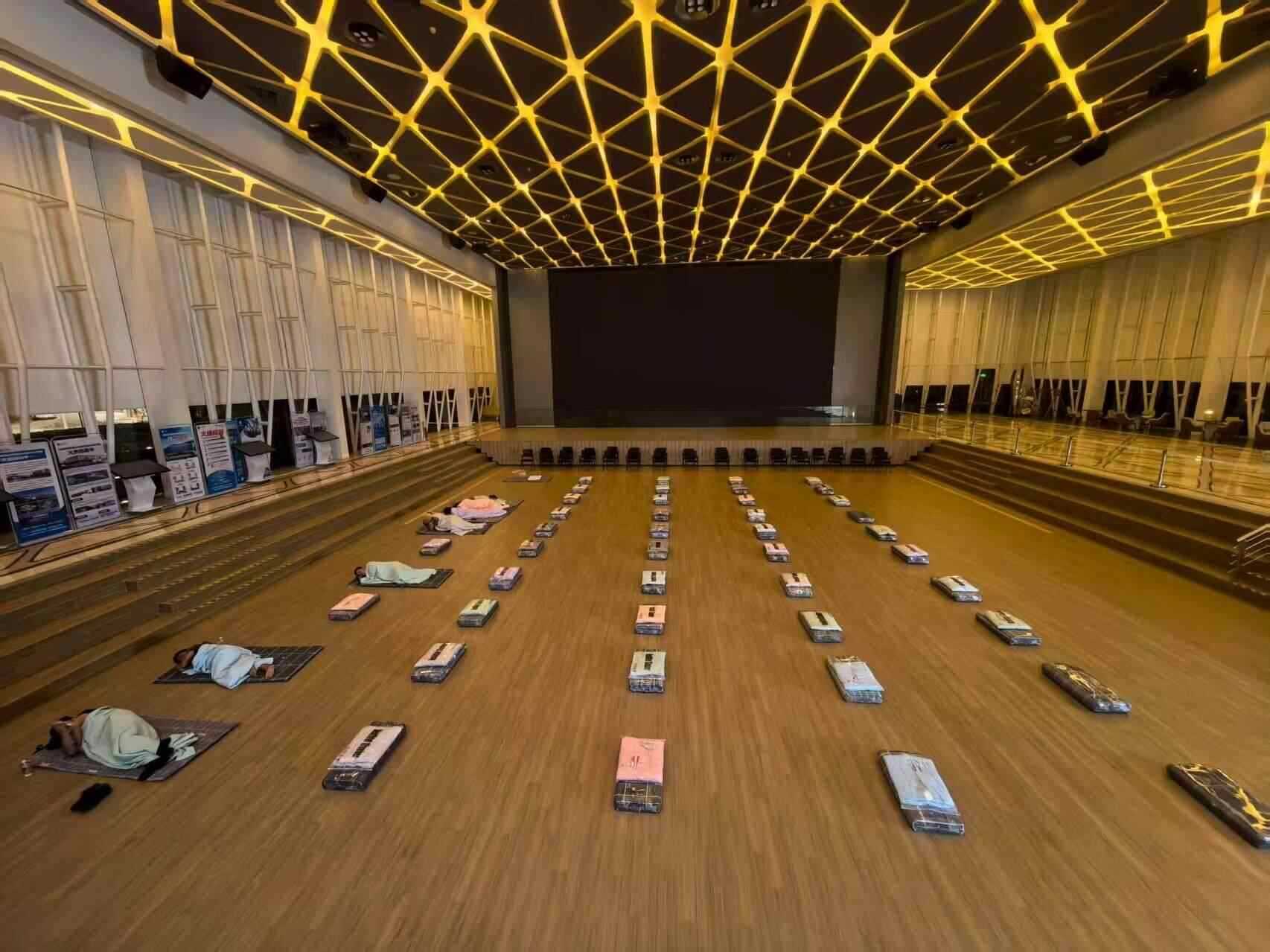 这里已变身为临时庇护点,连同两公里之外的国际海事服务中心,珠海经济技术开发区在台风之夜为建筑工人、环卫工人、外地司机等户外劳动者撑起温暖的“避风港”。