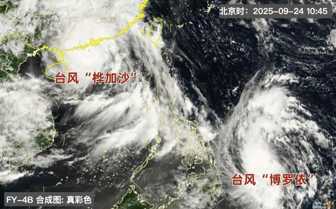 9月24日10时45分,台风“桦加沙”和台风“博罗依”的“合影” 国家卫星气象中心风云四号卫星天气应用平台截图 梁怿韬作标注