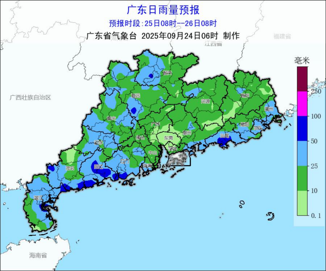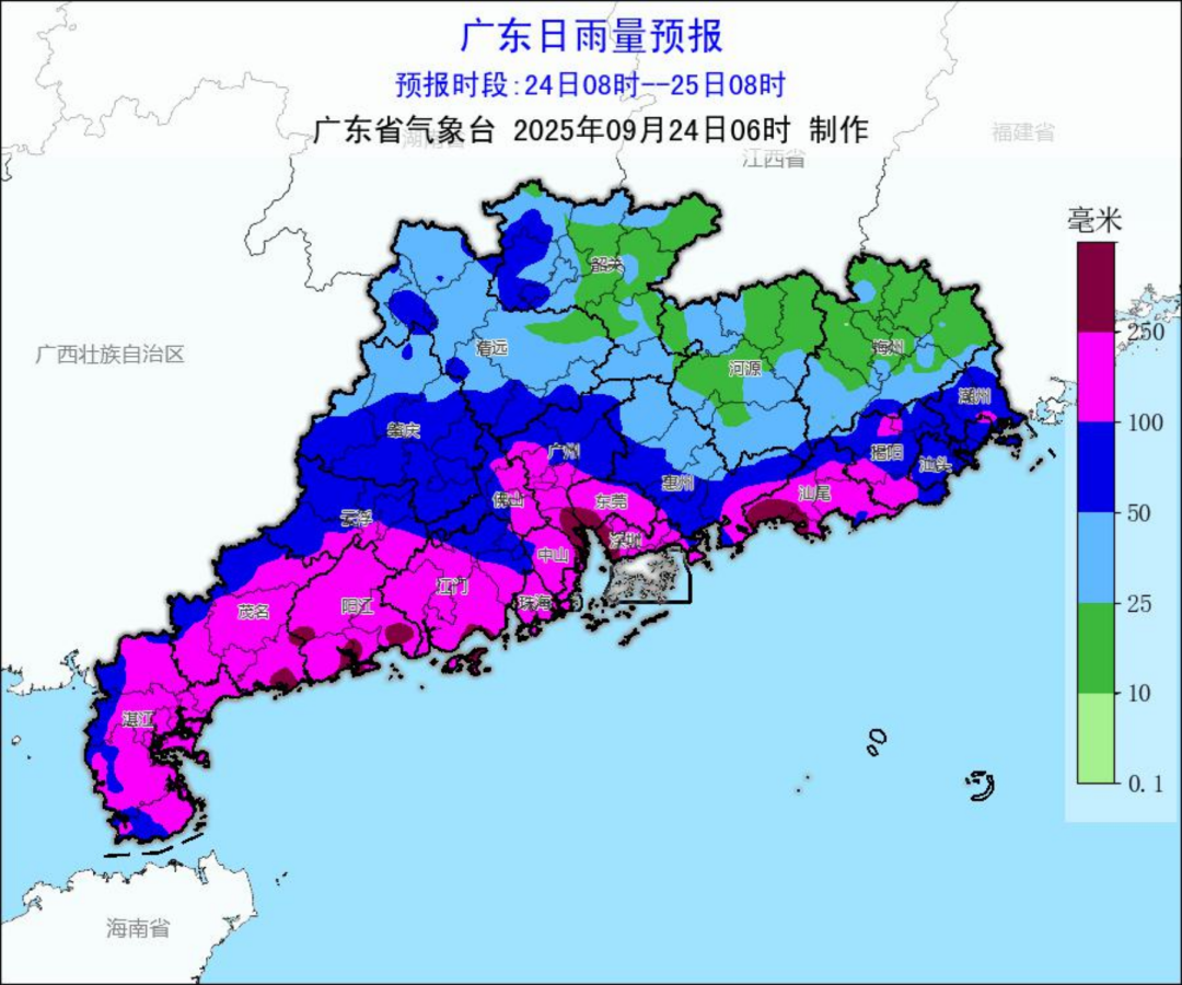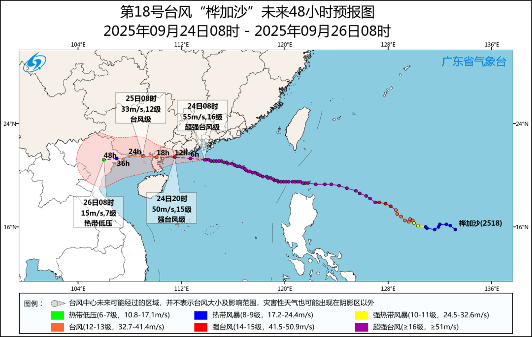 综合现有预报结论,广东省气象局9月24日分析,24日余下时间至25日,南海中北部海面、广东海面及中南部市县有大风高风险,船舶航行风险极高,海上电力设施、作业平台、海洋牧场等有损坏风险;可能出现树木倒伏、临时构筑物损坏或倒塌。广东中南部市县暴雨灾害为中高风险,容易出现中小河流洪水、山洪、地质灾害和城乡积涝。