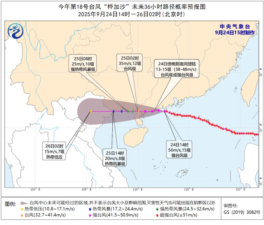 中央气象台观测,“桦加沙”中心9月24日14时,距离广东省阳江市东偏南方向约75公里,中心附近最大风力15级,降级至强台风级。预计“桦加沙”将以每小时20-25公里的速度向偏西方向移动,强度逐渐减弱。预计“桦加沙”登陆时,强度将维持强台风级,或进一步减弱至台风级。