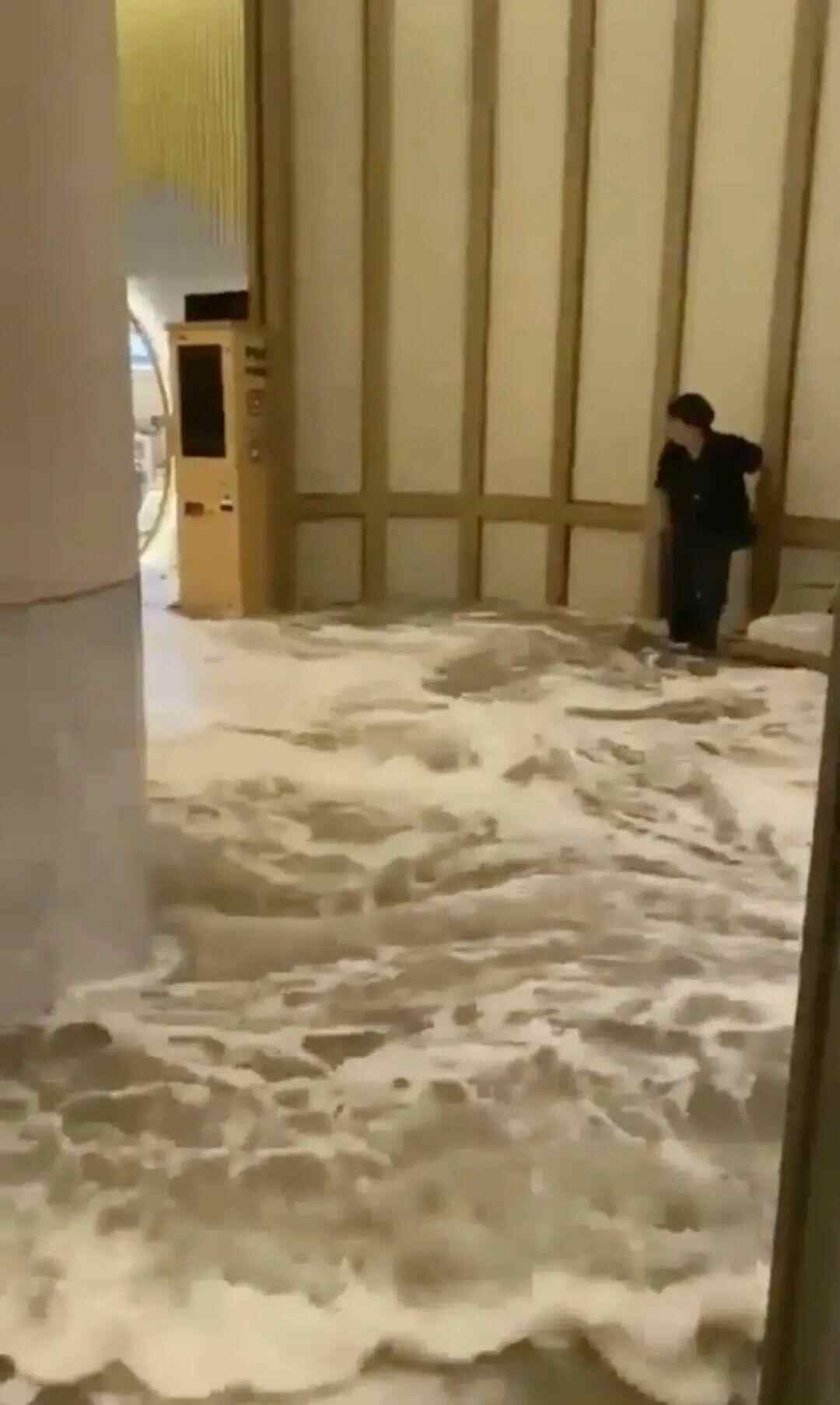 24日,有网友在社交平台上传视频,称香港富丽敦海洋公园酒店作了加固的玻璃门被海水冲破。视频画面显示,酒店大堂内海水漫灌,有人被海水冲击倒下。
