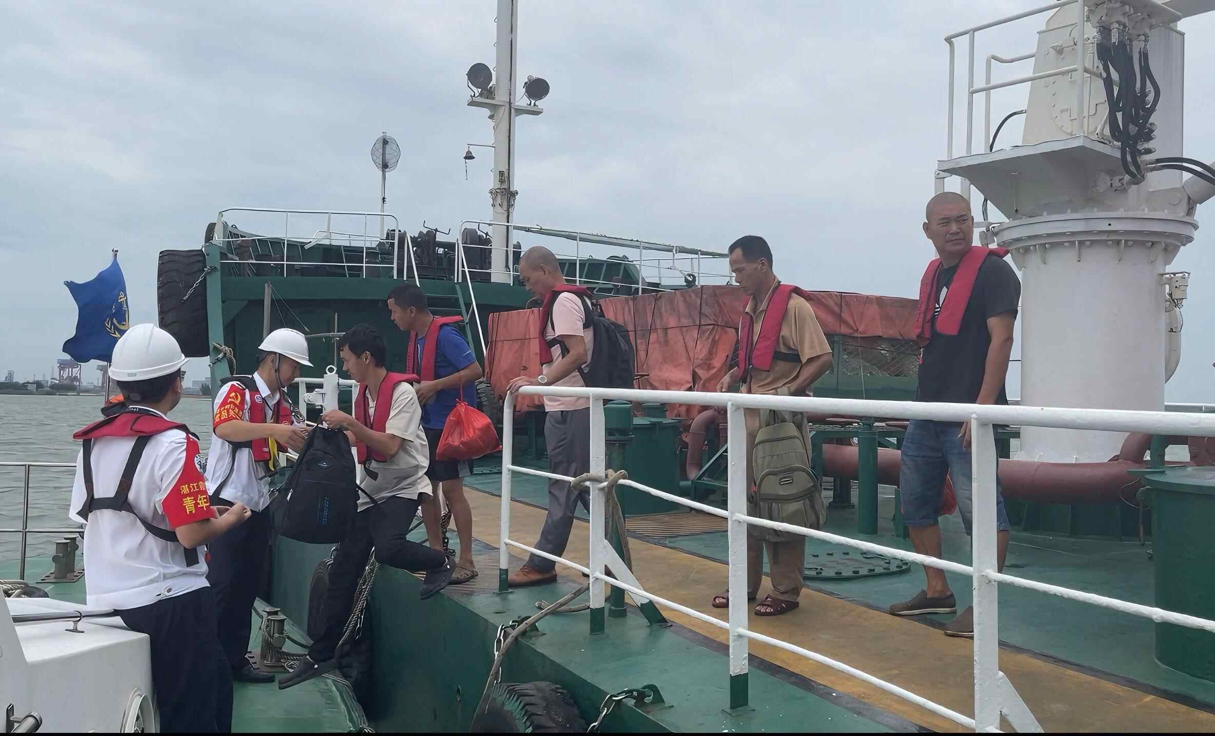 为高效推进船舶人员转移,霞山海事处调派“海巡09056”、霞海海事处派出“海巡09057”等两艘船艇,协同“龙腾拖401”“龙腾拖501”等两艘拖轮,组成“海巡+拖轮”联合编队,深入湛江湾内锚地开展撤离工作。10名海事执法人员顶风破浪,逐船摸排,利用高音喇叭持续发布预警,现场讲解台风动态与撤离要点,同步加固船舶系泊设施,安全排查与人员转移同步推进。